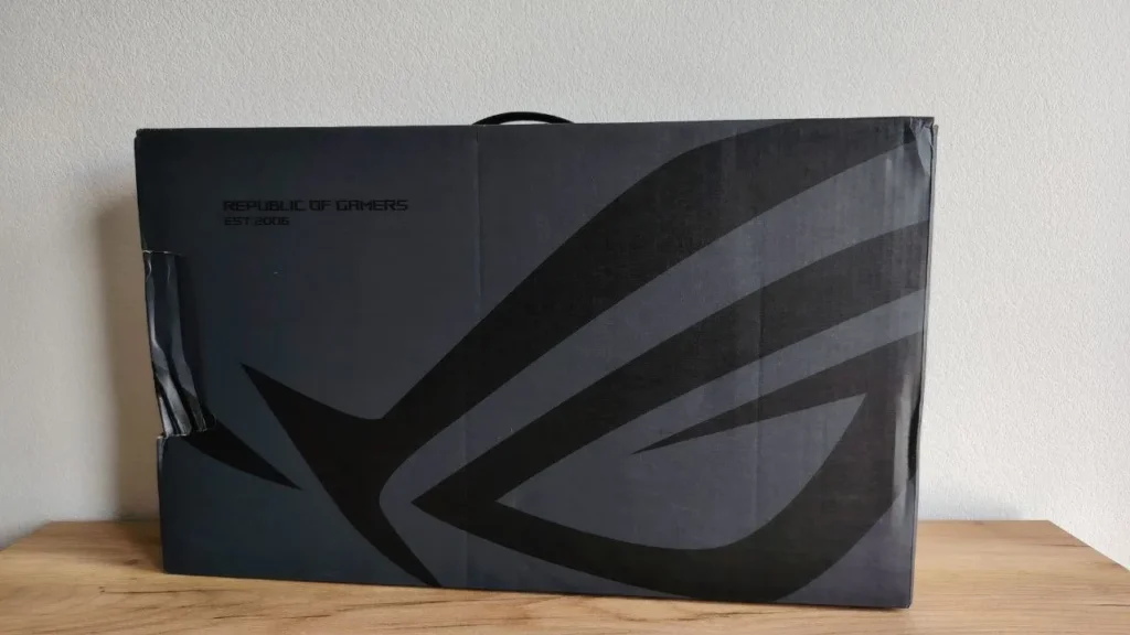 The laptop comes in a traditional dark gray cardboard box, dominated by a large black ROG logo that spans almost the entire front. Next to it, ASUS uses its signature typography to print “Republic of Gamers,” along with the brand’s founding year 2006.