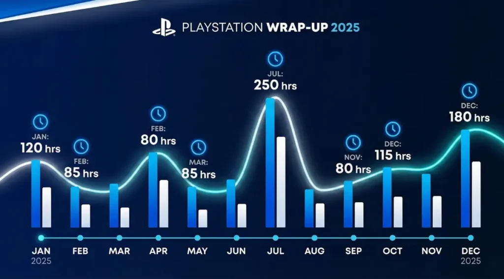 One of the most eye-opening sections shows exactly how many hours you’ve invested across your entire PlayStation library. Monthly trends illustrate when you were most active perhaps during summer break or those long winter nights Your most-played title gets special attention with detailed breakdowns and you’ll see consistency patterns that reveal whether you’re a binge player who devotes intense sessions to single games or a variety seeker who samples multiple experiences.