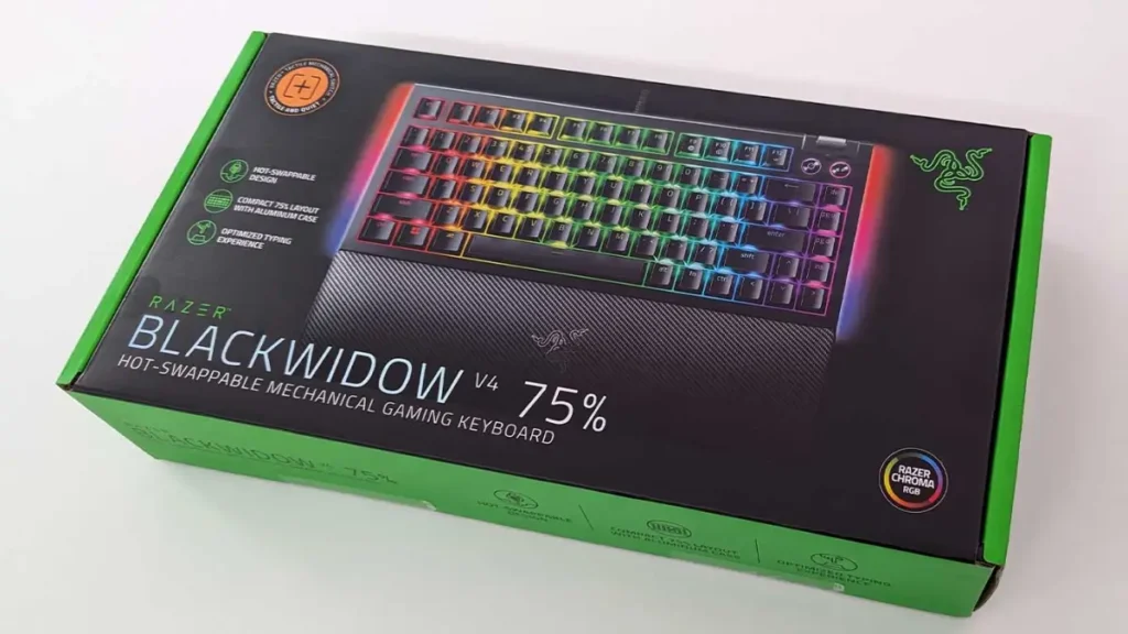 The razer blackwidow v4 pro comes packaged in an elongated box with full-color printing that shows the keyboard and highlights its main features such as immersive lighting additional macro and media keys mechanical switches and a magnetic wrist rest. If the device is displayed on a store shelf a potential buyer can quickly understand what to expect and make an informed purchasing decision based on this information.