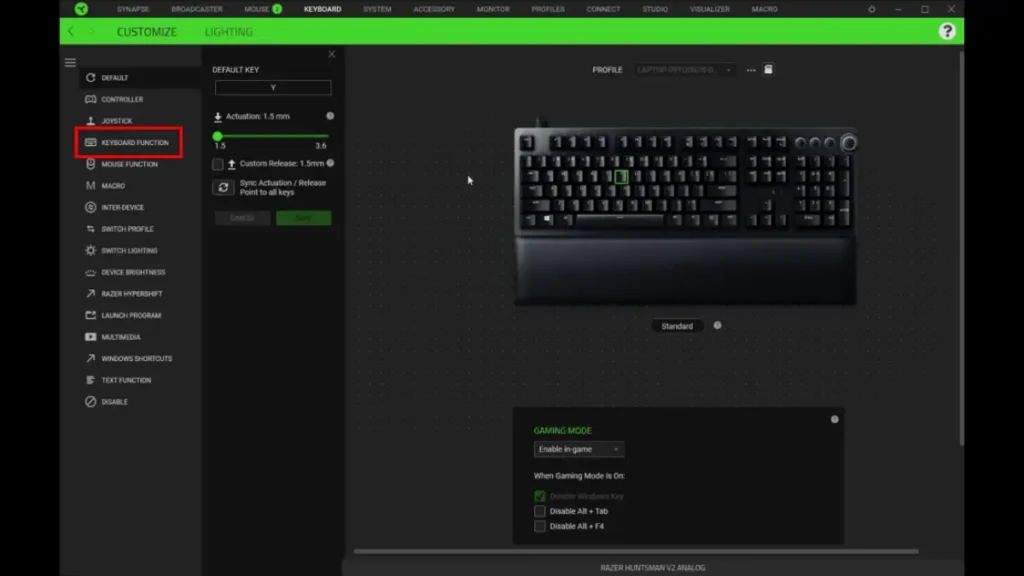 For deeper customization you need to install the razer synapse software. Two main tabs are available for the razer blackwidow v4 pro.